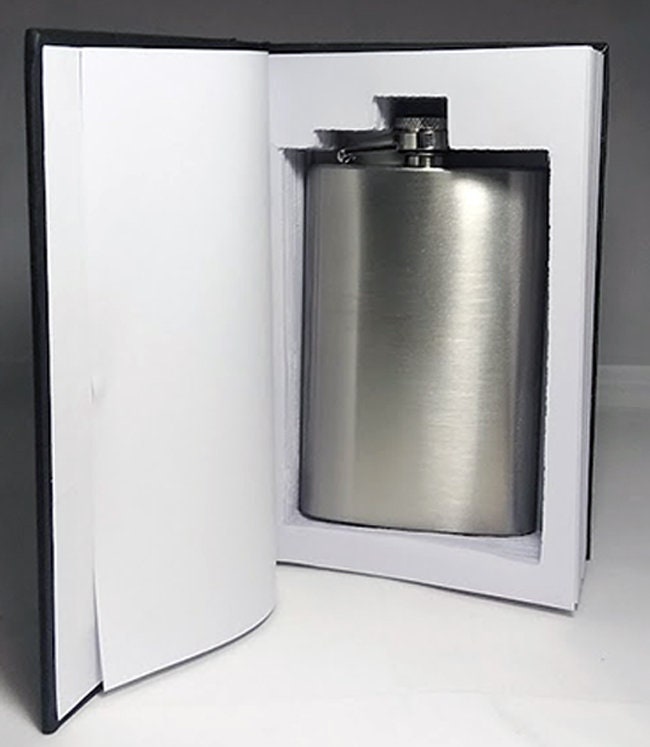 Conceal your flask in a carry along sized bible! Stainless steel 4 oz flask fits in to a secret compartment hidden within the bible. The outside of the bible says "Holy Bible" with a cross, and the book even features an elastic band that keeps the book closed. By storing the flask with the pages of the bible you can avoid detection of the flask and take it with you where ever you go... even church. (We wont tell the pastor). This Holy Bible has blank pages with no scripture on the inside, so it's not sacrilegious and dose not deface the word of God. The book itself measures 4" x 6" x 1".